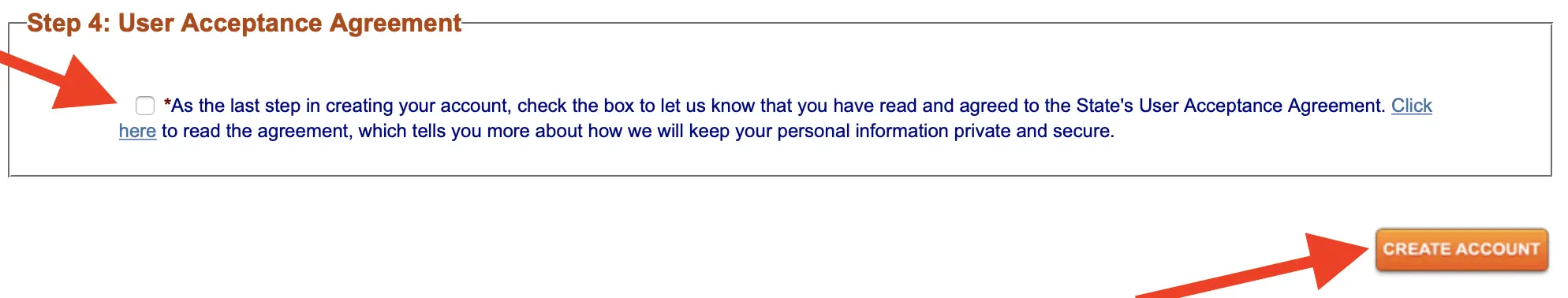 The last step when creating your Georgia Gateway account is to access the User Agreement. To do this, just check the box and click the “Create Account” button.