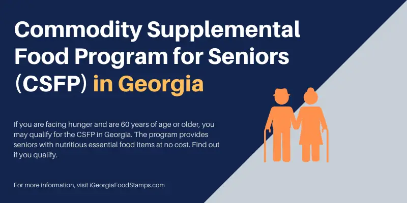 If you are sixty (60) years of age or older and are experiencing food insecurity, you may qualify for the Commodity Supplemental Food Program (CSFP). This is a supplemental program offered to low-income seniors in Georgia. The CSFP provides Georgia seniors with nutritious essential food items and nutrition education at no cost.