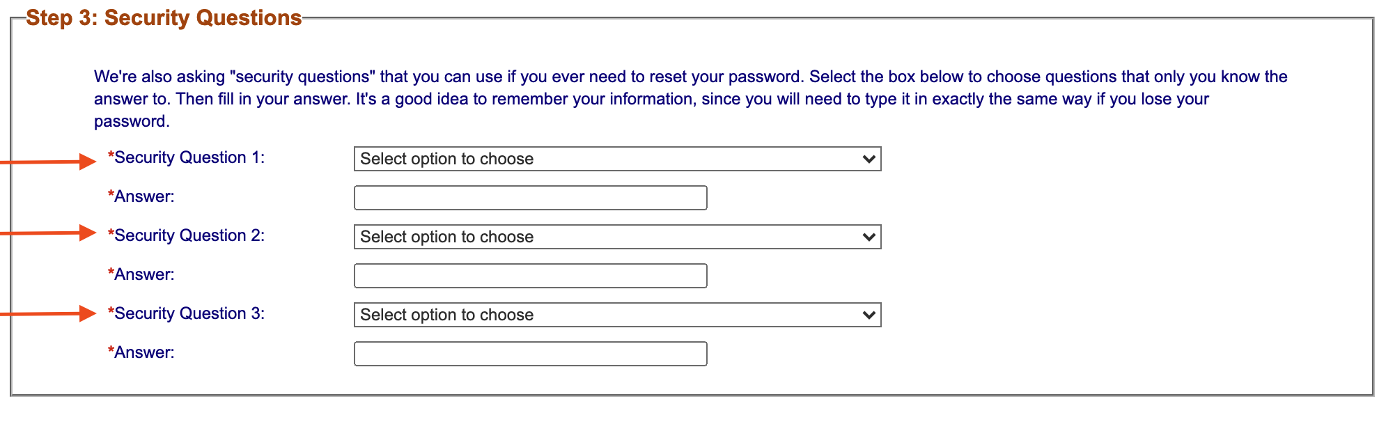 Select a question from the dropbox menu provided and type the answer in the box below. Complete this process for the three security questions provided.