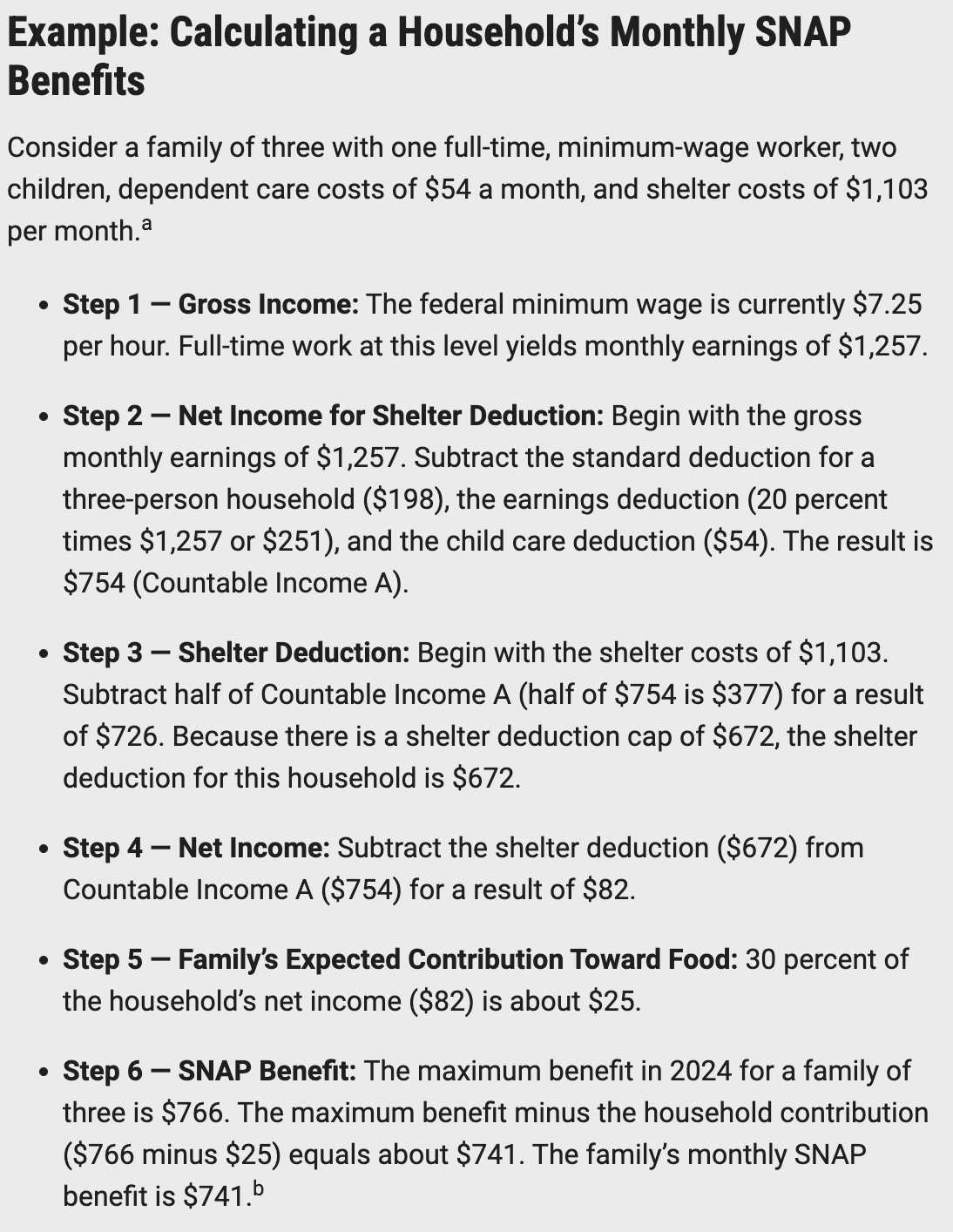However, if a family has $600 in net monthly income, they will receive the maximum SNAP benefit ($766) amount minus 30 percent of their net income ($180) for a total benefit amount of $586 per month.