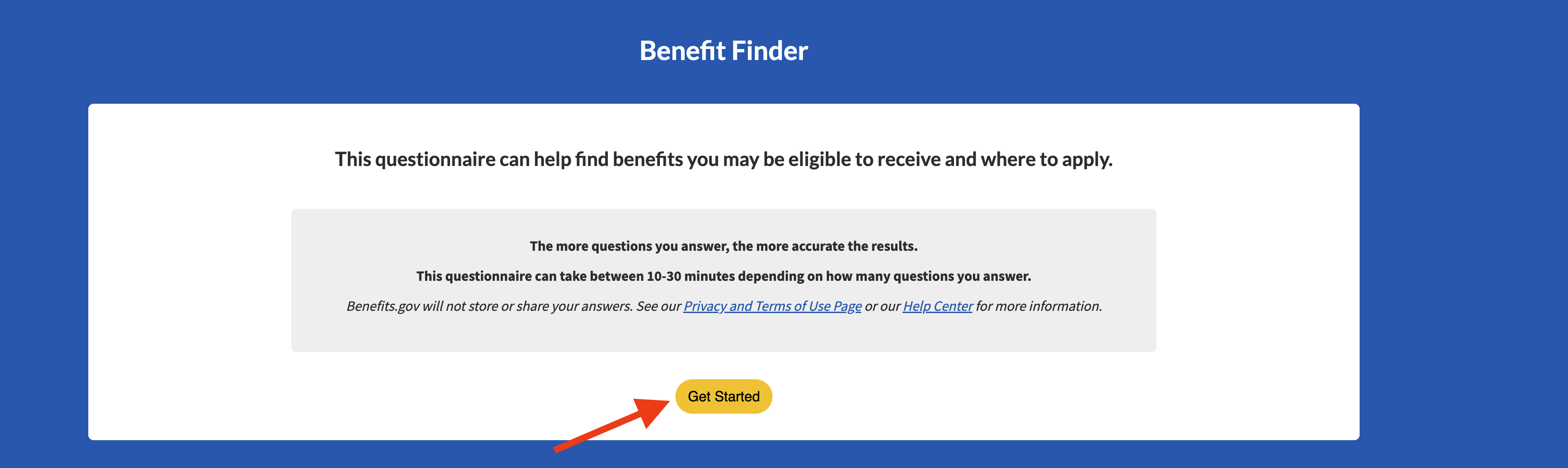 To do so, click the text that says, “Start Benefit Finder” – as seen in the screenshot above.