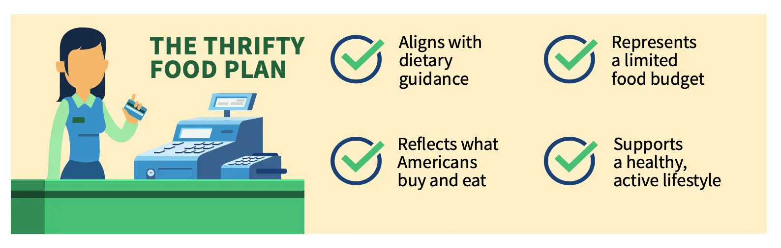 The Thrifty Food Plan takes into account the current food prices, what Americans typically eat, dietary guidance, and the nutrients in food items. For example, the updated Thrifty Food Plan includes more fish and red and orange vegetables.