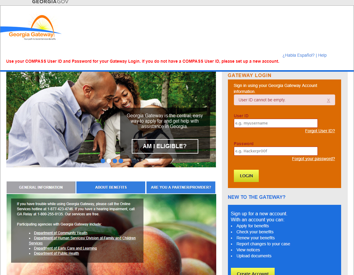 The Georgia Gateway online benefits portal allows Georgia residents to access, update, apply, and determine eligibility for government assistance benefits. The Gateway.ga.gov website is managed by the Georgia Division of Family and Children Services (DFCS).